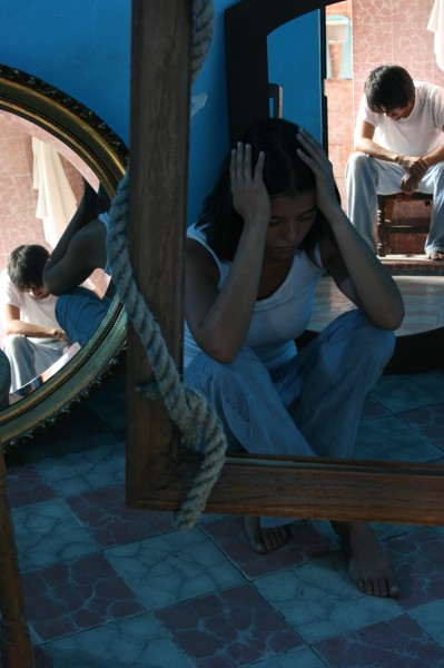 Los espejos, hombre y mujer no pueden verse a sí mismos a pesar del espacio reducido entre ellos para un encuentro satisfactorio; se rodean, se miran, se buscan, se enojan, se desesperan… Y no pueden encontrarse. Tan sólo bastaría el atrevimiento de él para saltar del otro lado del espejo; ella no necesitaría más que querer darse cuenta que no hay límites para su encuentro… Ninguno atraviesa. Al final no se han dado cuenta que son uno y el mismo, negando al otro, negándose las posibilidades del otro. Allí surgiría la respuesta a la pregunta: ¿Quién mira en el espejo cuando crees que te estás mirando?