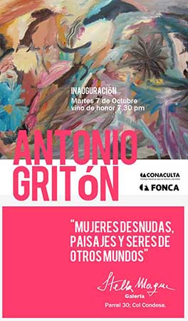 Desde el martes 7 de Octubre la exposición: "MUJERES DESNUDAS, PAISAJES Y SERES DE OTROS MUNDOS" En la Galería Stella Magni, a las 8 pm, en la calle de Parral núm 30, Col. Condesa (a unas 3 cuadras del Plaza-Condesa), Ciudad de México. La exposición estará abierta al público hasta el 21 de Octubre inclusive. Para visitar la exposición cualquier día después de la inauguración, hay que llamar antes al tel: 50-19-62-82 o al celular: 04455-16-98-41-79.